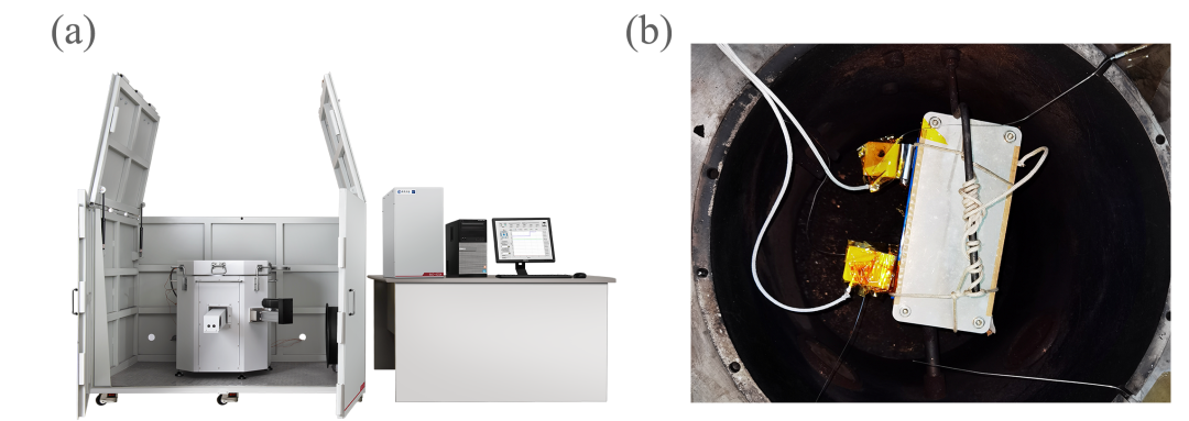 圖1 (a)BAC-420A大型電池絕熱量熱儀和(b)電池樣品安裝示意圖