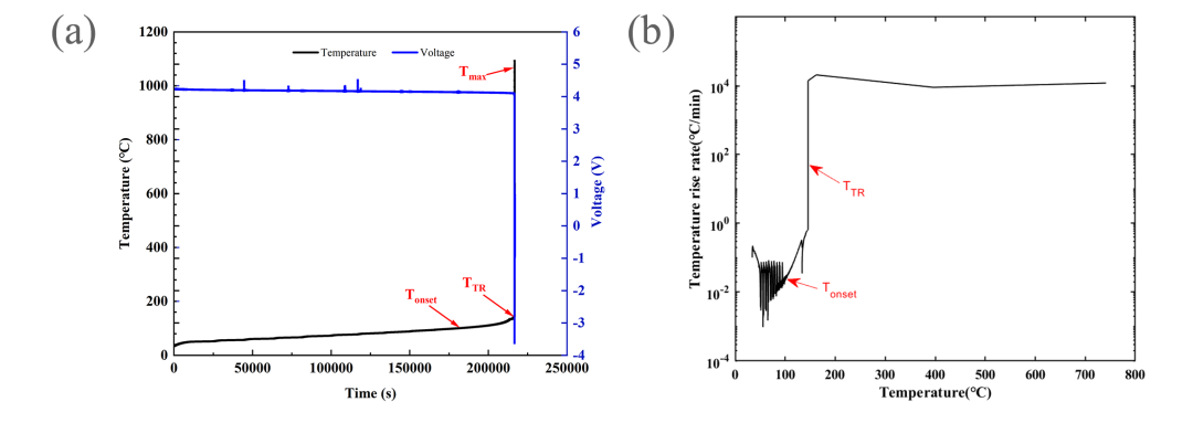 圖2 190Ah電池熱失控(a)溫升/電壓-時間曲線和(b)溫升速率-溫度曲線