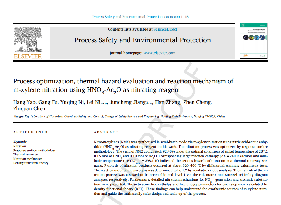 南京工業(yè)大學(xué)倪磊教授團(tuán)隊在 Process Safety and Environmental Protection 期刊發(fā)表題為 Process optimization, thermal hazard evaluation and reaction mechanism of m-xylene nitration using HNO3-Ac2O as nitrating reagent 論文,該成果由國家自然科學(xué)基金項目(No. 21927815, 52334006, 52274209)等支持。