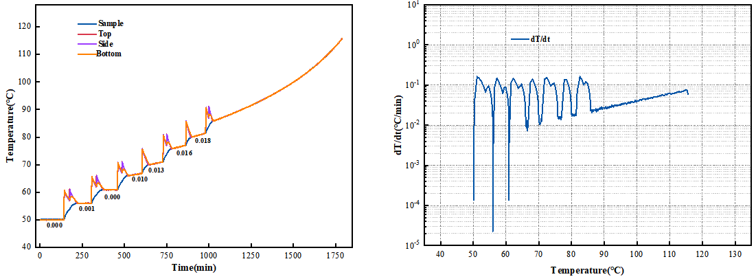 圖5使用金屬板夾具的標(biāo)準(zhǔn)電阻塊HWS溫升(左圖)及溫升速率-溫度(右圖)曲線