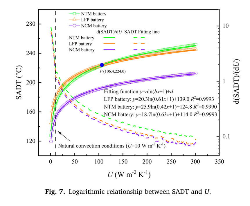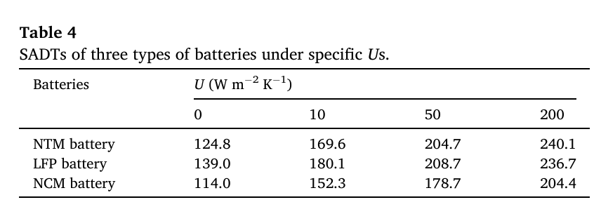 3. 在自然對流條件下,當(dāng)儲存溫度超過169.6 ℃時,完全充電的NTM電池會自燃。在電池儲存和運輸過程中增加系統(tǒng)表面?zhèn)鳠嵯禂?shù)U已被證明可以顯著提高NTM電池相對于LFP和NCM電池的安全性。