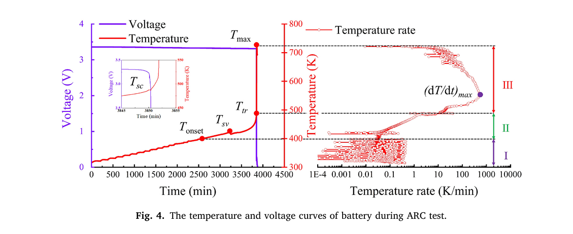利用BAC-420A的HWS模式開展熱失控測試,模擬絕熱環(huán)境并記錄溫度、電壓等數(shù)據(jù)。確定了自放熱起始溫度(Tonset)、熱失控起始溫度(TTR)和熱失控最高溫度(Tmax)等關(guān)鍵溫度點(diǎn),實(shí)驗(yàn)將熱失控過程分為三個(gè)階段,明確了各階段的反應(yīng)和溫度變化特點(diǎn)。