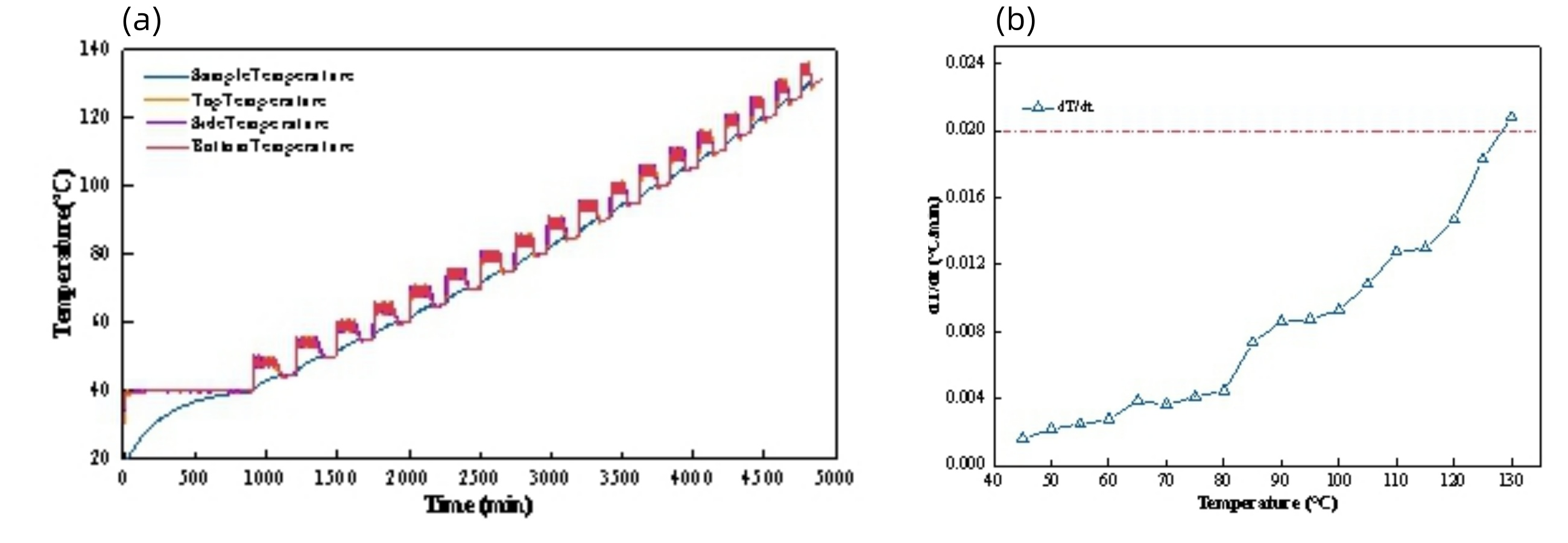 圖3 #01電池絕熱溫升特性試驗(a)電池升溫曲線和(b)溫升速率-溫度曲線