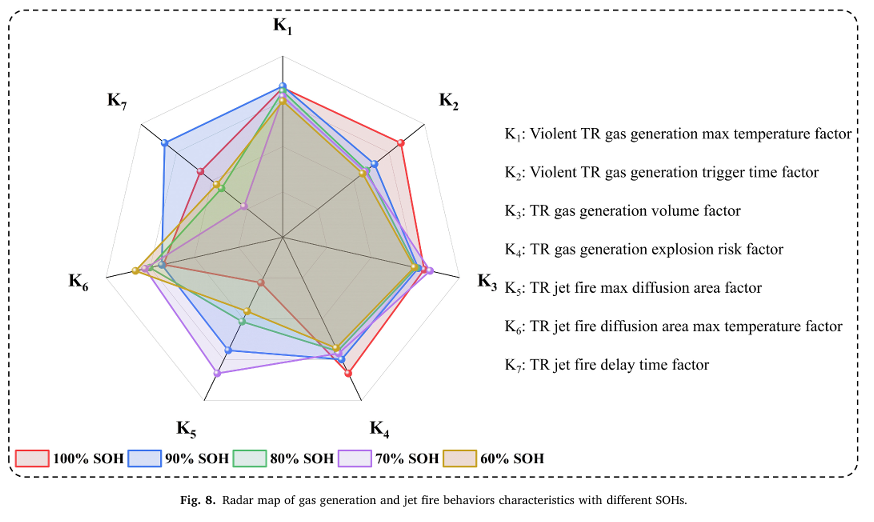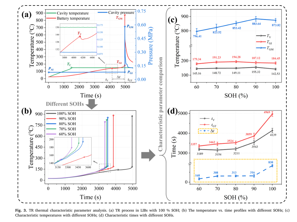 本研究還通過開展不同SOH電池的熱失控噴射火行為實(shí)驗(yàn),結(jié)合熱失控產(chǎn)氣參數(shù)進(jìn)行應(yīng)用場景下的綜合特性分析,為儲(chǔ)能系統(tǒng)及電動(dòng)汽車的電池管理系統(tǒng)(BMS)安全設(shè)計(jì)提供了關(guān)鍵技術(shù)指導(dǎo)。