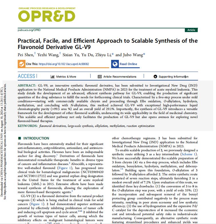 中國藥科大學(xué)李志裕教授團(tuán)隊(duì)在Organic Process Research & Development期刊發(fā)表題為《Practical, Facile, and Efficient Approach to Scalable Synthesis of the Flavonoid Derivative GL-V9》的研究論文,該成果由中國藥科大學(xué)藥學(xué)院藥物化學(xué)系支持。
