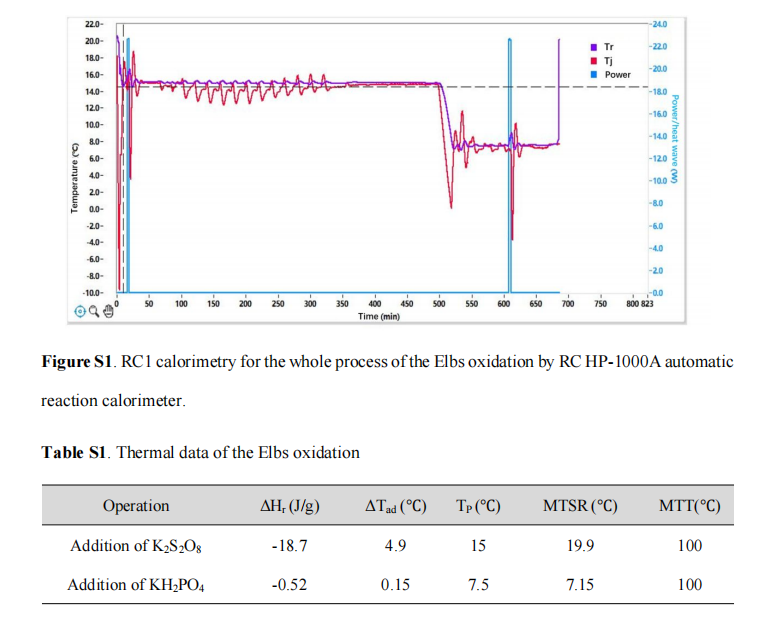 Elbs氧化反應(yīng)是GL-V9合成的首個(gè)關(guān)鍵步驟。研究團(tuán)隊(duì)利用RC HP-1000A自動(dòng)反應(yīng)量熱儀,成功獲取了該反應(yīng)過程中的比放熱焓(ΔHr)、絕熱溫升(ΔTad)、失控最高溫度(MTSR)等核心熱風(fēng)險(xiǎn)參數(shù)?;谶@些數(shù)據(jù),不僅驗(yàn)證了Elbs氧化工藝的安全性,更為該工藝?yán)鋮s系統(tǒng)的選型及操作規(guī)范的制定提供了定量依據(jù)。